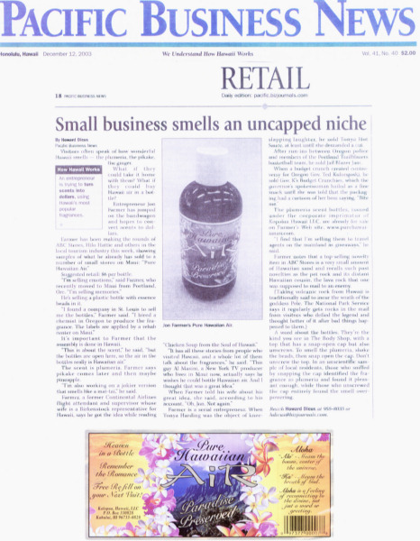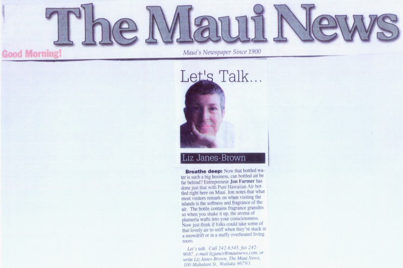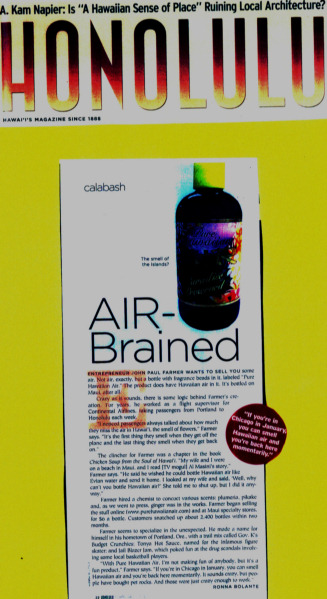 "I noticed passengers always talked about how much they miss the Air in Hawaii, the smell of flowers." John Paul Farmer From the article 'Air Brained' by Ronna Bolante in the Feb-2004 issue of Honolulu Magazine.